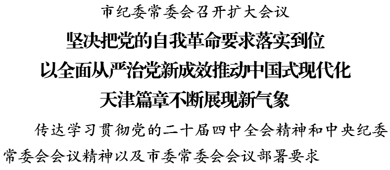 日前,市纪委常委会召开扩大会议,传达学习党的二十届四中全会精神和中央纪委常委会会议精神以及市委常委会会议部署要求,研究贯彻落实措施。市委常委、市纪委书记、市监委主任王庭凯主持会议并讲话。会议指出,党的二十届四中全会是在向第二个百年奋斗目标进军的新征程上举行的一次十分重要的会议。习近平总书记在全会上的重要讲话,深刻阐释了“十五五”时期经济社会发展的重大意义、面临形势、指导思想、重大原则、重大战略任务和根本保证,为我们深入学习贯彻全会精神提供了行动指南。全市各级纪检监察机关要深入学习贯彻四中全会精神,与学习贯彻习近平总书记视察天津重要讲话精神结合起来,更加坚定拥护“两个确立”、坚决做到“两个维护”,切实把思想和行动统一到党中央决策部署上来,坚决把党的自我革命要求落实到位,从全局谋划一域、以一域服务全局,以全面从严治党新成效推动中国式现代化天津篇章不断展现新气象。会议强调,要保持以党的自我革命引领社会革命的高度自觉,持之以恒推进全面从严治党,找准找实服务保障的切入点着力点。要扛牢政治监督这个首要职责、根本职责,严明党的政治纪律和政治规矩,及时发现和纠治政绩观错位、贯彻执行做选择搞变通打折扣等问题。要推进党的作风建设常态化长效化,巩固深入贯彻中央八项规定精神学习教育成果,一严到底纠治“四风”,重点纠治形式主义、官僚主义,坚决破除特权思想和特权行为。要坚定不移开展反腐败斗争,把严的基调、严的措施、严的氛围长期坚持下去,紧盯重点领域,严查腐败问题,深化以案促改促治,加强新时代廉洁文化建设。要坚持执纪执法为民、纠风治乱为民,持续监督推动惠民富民政策落地见效,深入抓好群众身边不正之风和腐败问题集中整治,让群众更加可感可及。要做好全会精神的学习宣传贯彻,领导干部示范带头,引导广大纪检监察干部原原本本学、融会贯通学、联系实际学,加强宣传宣讲,营造浓厚氛围,切实把全会精神转化为推动纪检监察工作高质量发展的强大动力。